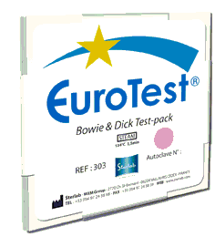 Eurotest est un test de Bowie&Dick à usage unique prêt à l\'emploi fabriqué par Sterlab. Eurotest s\'utilise comme tout test pêt à l\'emploie. une fois le cycle utilisé, ouvrir le test et récupérer la feuille réactive dans le pack afin d\'y noter les éléments de traçabilité dans les cases prévues à cet effet.